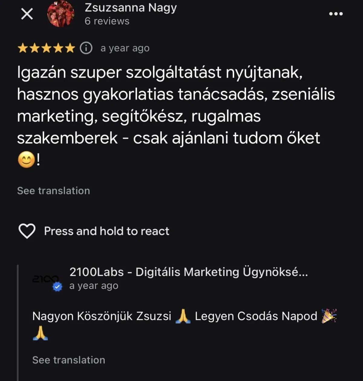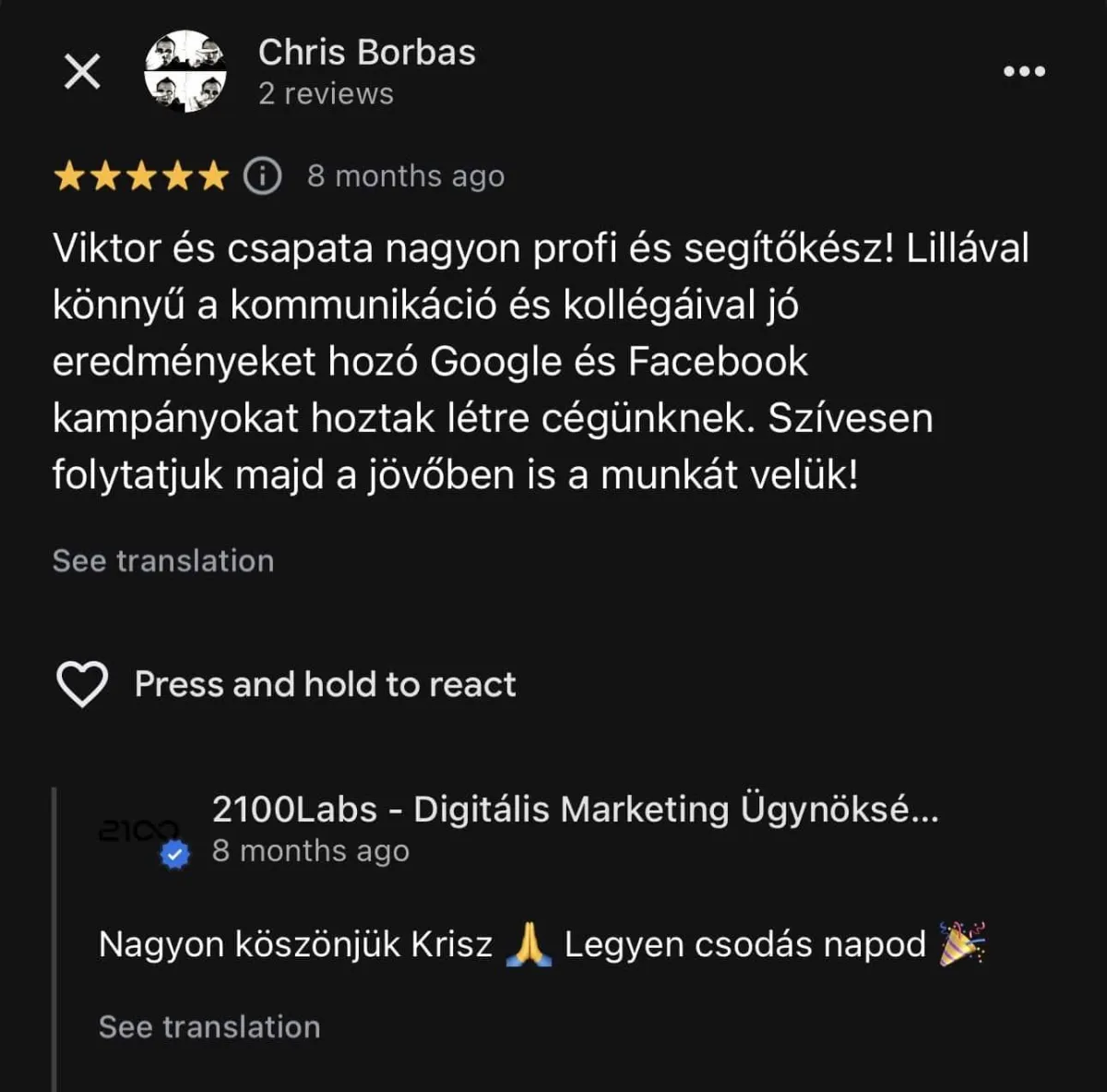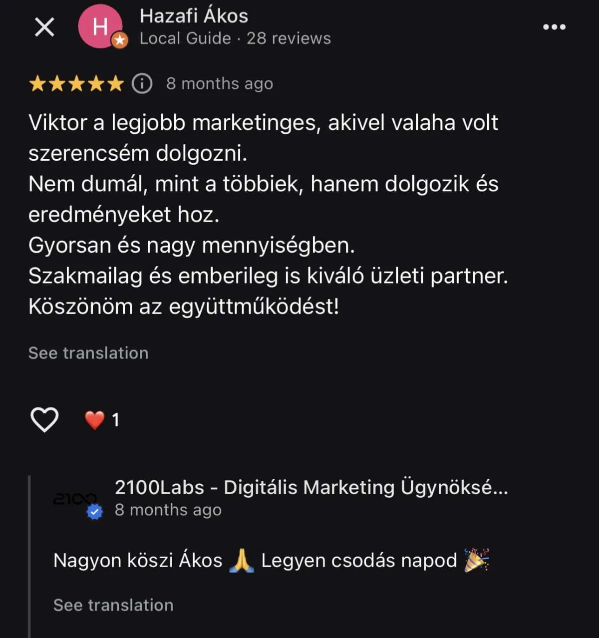 Magyarország egyik legjobban értékelt marketing ügynöksége vagyunk. Több, mint 5 milliárdot generáltunk már az ügyfeleink részére. Végre egy csapat, aki nem csak kampányokban, hanem eladásokban gondolkozik. Minden egyes nap "Thunderbolt" belsős képzésen vesz részt az elit alakulatunk, ami elősegíti, hogy legújabb AI megoldások segítségével turbózzuk az ügyfeleink eladásait.